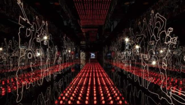Зеркальная комната японского художника Яёи Кусамы создана при помощи установки зеркальных панелей вокруг стен, потолка и пола небольшого замкнутого пространства. Она украшена сотней тысяч светящихся разноцветных огоньков, превращаясь в огромную и бесконечную темноту, подсвеченную отблесками огней.