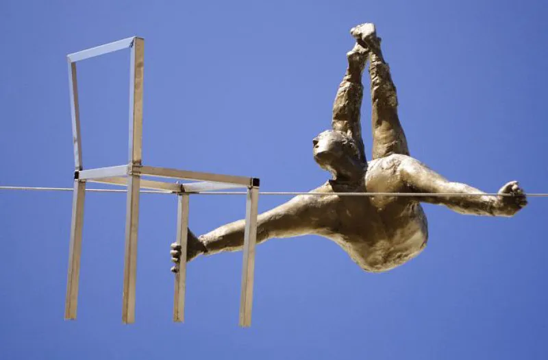 Застывшие каменные скульптуры будто передвигаются по тонким тросам в различных позах и с разными предметами. Но бывает также, что мастер использует в своей работе и других персонажей, далеких от цирка и спорта. Героями его работ, как правило, выступают циркачи: гимнасты и жонглеры, акробаты и канатоходцы, – соблюдение равновесия для которых – естественное состояние.