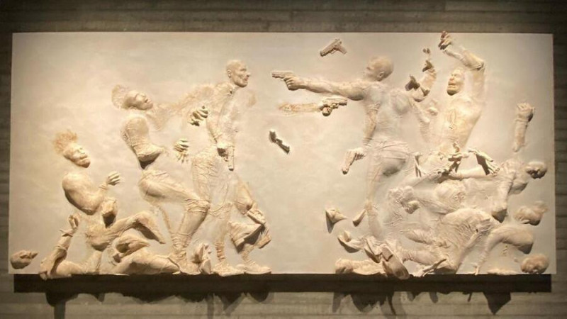 На выставке «Мы» Брэд Питт представил девять работ, среди которых есть по-настоящему интересные экспонаты. Например, гипсовое панно, отлитое с использованием многочисленных слепков человеческого тела. Здесь он запечатлел динамичную сцену перестрелки. Также публика отметила серию силиконовых кубов, символизирующих дома, в которые впечатаны пули разного калибра, и миниатюрный дом, сделанный из коры дерева и скреплённый скотчем.