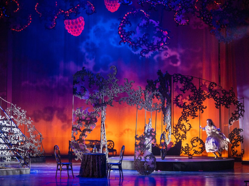 В целом же севастопольский спектакль напрочь лишён мелодраматических «атрибутов». В нём много пауз, внимающих тишине. Много красивых живых картин, фиксирующих настроения героев (дань моде XIX века). Режиссёр разработал интонационную партитуру языка комедии во взаимосвязи с одновременно деликатными и яркими вкраплениями «музыкальных моментов», а в сценографической палитре задумал смешать монохромную графичность кружев с сочным колоритом спелой малины.