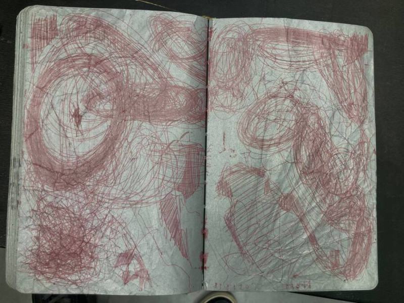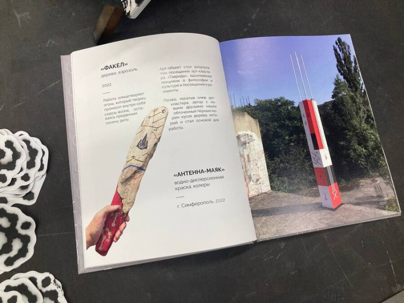 Но помимо работ, посвящённых представителю внеземной цивилизации, на выставке ещё представлены картины и инсталляции автора, которые отражают его отношение к миру. А также один из шести скетчбуков, в котором, пролистав, можно увидеть ход творческих размышлений автора.