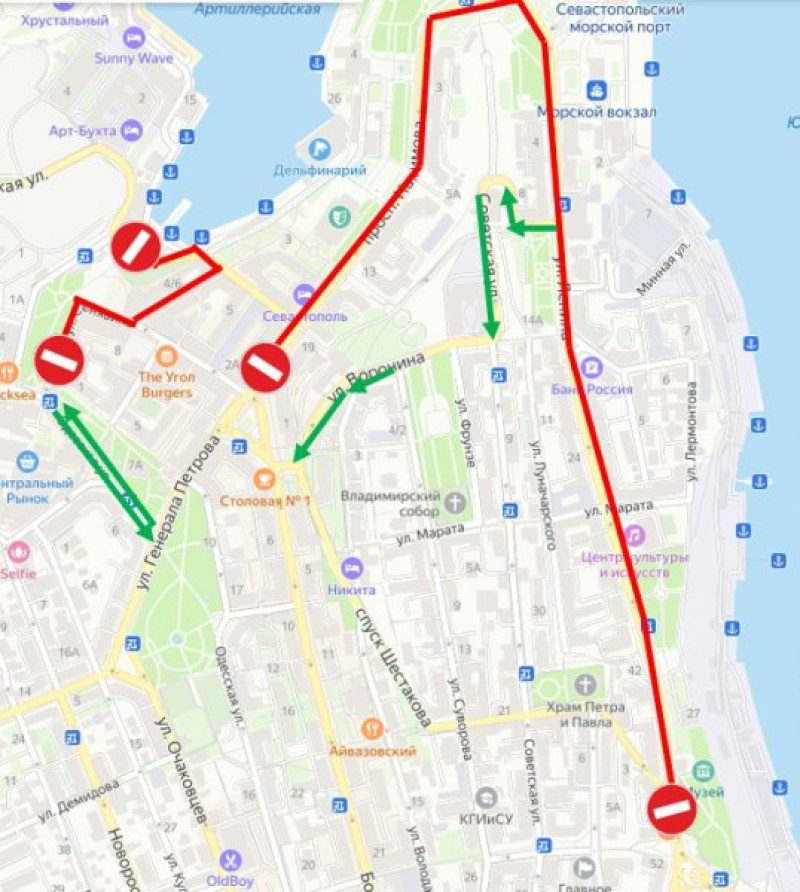 Кроме того, с 5-00 до 15-00 изменится направление одностороннего движения по ул. Советская от пересечения с ул. Воронина до ул. Ленина и ул. Воронина от ул. Суворова до ул. Спуск Шестакова. На ул. Одесской от ул. Новороссийская до ул. Сенявина в это время введётся двухстороннее движение.