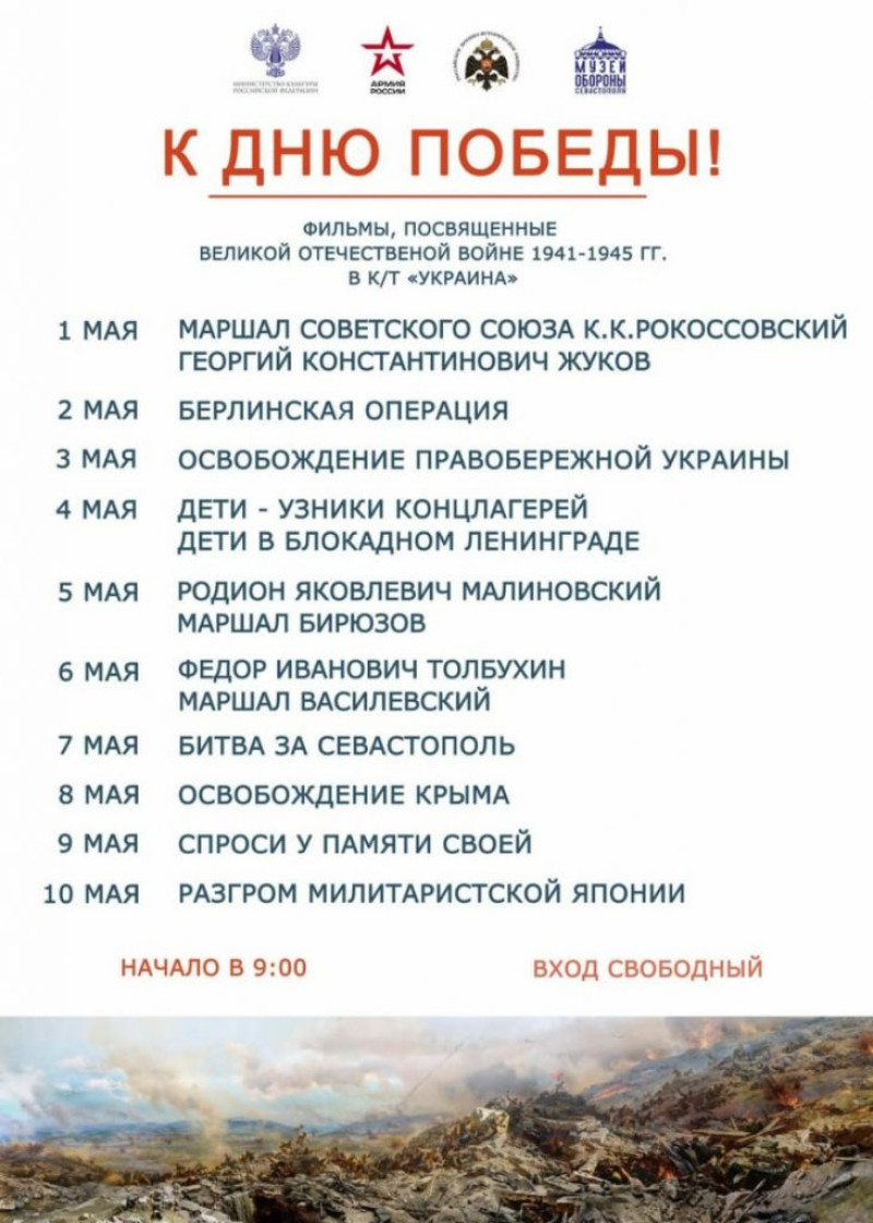 В выставочном центре на ул. Ленина, 35 (бывший кинотеатр «Украина») ежедневно будут показываться фильмы на военную тематику. Вход свободный.