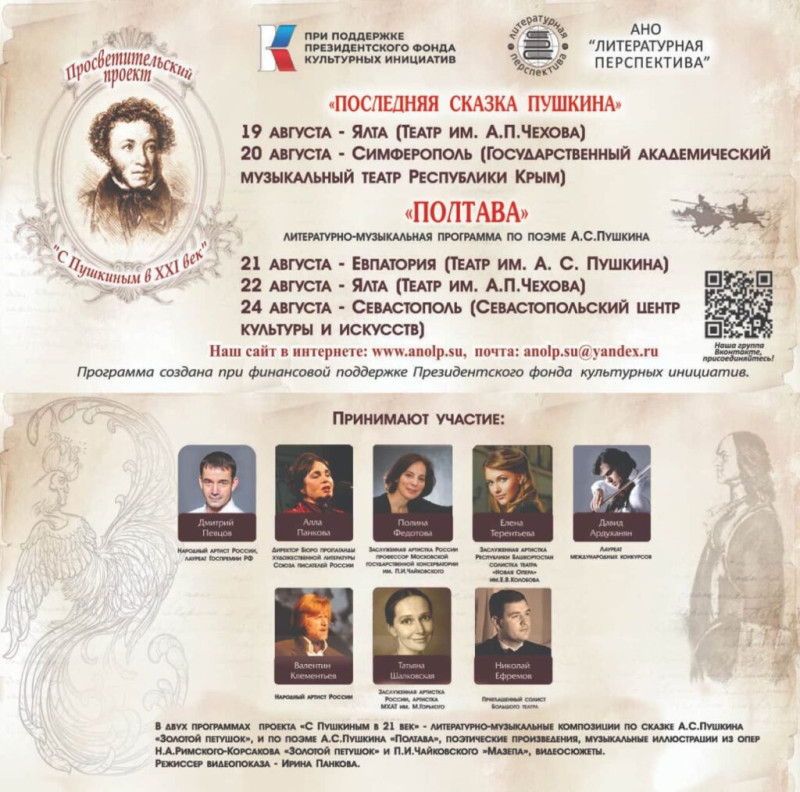 В августе в Крыму, в рамках проекта «С Пушкиным в 21 век», поддержанного Президентским фондом культурных инициатив, пройдут театрализованные литературно-музыкальные программы «Последняя сказка Пушкина» и «Полтава» по произведениям основоположника отечественной литературы А.С.Пушкина. Программы представит руководитель проекта — народный артист России, лауреат Госпремии России Дмитрий Певцов.