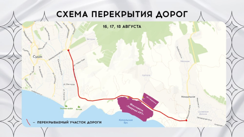 С 16 августа по 19 августа в круглосуточном режиме движение по автомобильной дороге протяженностью 5 км в районе поворота на бухту Капсель, на автомобильной дороге Судак — Миндальное — Солнечная Долина, будет перекрыто (см. схему). Это связано с применением высоких мер безопасности в рамках проведения фестиваля «Таврида. АРТ».