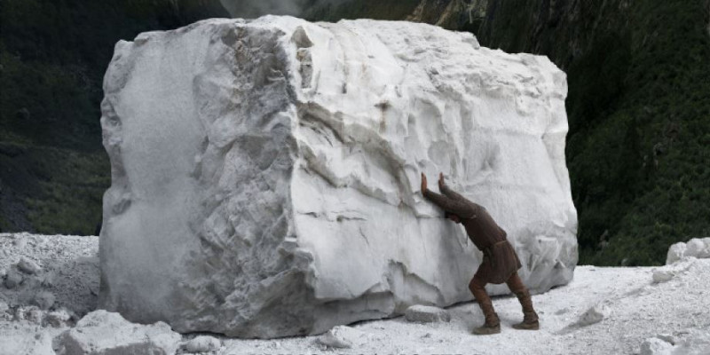 Только раз показано это отсутствие компромисса – когда Микеланджело решает взять целый мраморный блок огромного размера (тот самый «монстр») и организует беспрецедентную операцию по его спуску с горы. Он берёт на себя всю ответственность, он всё ставит на карту, он несоразмерные деньги платит, лишь бы всё было так, как ему нужно, как он задумал; но в какой-то момент эта сила, мощь, бескомпромиссность ради творческой идеи вдруг иссякает, разменивается на кузнечные железки.