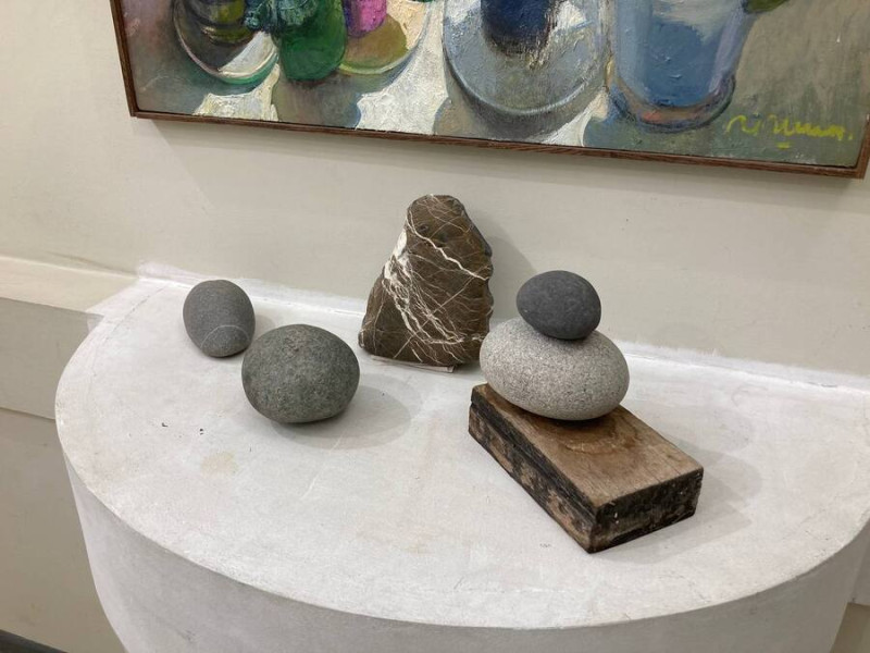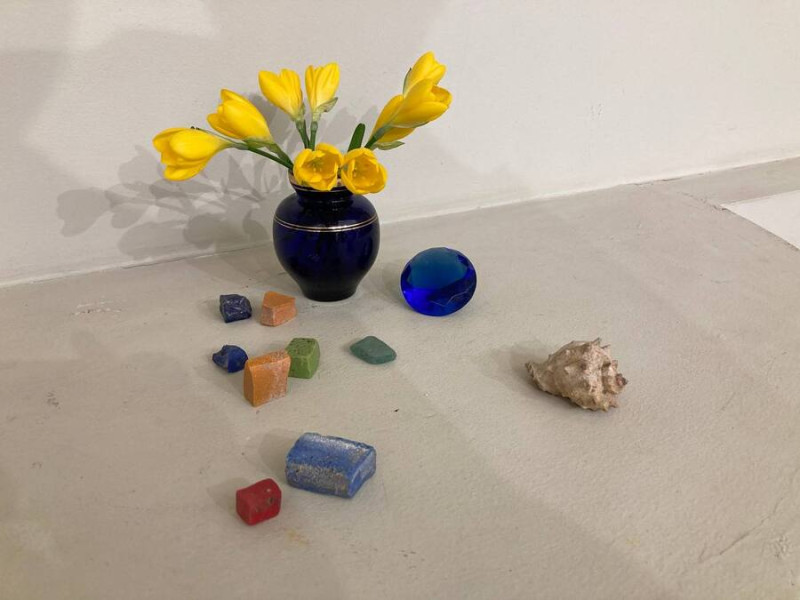 Экспозицию Шипилин дополнил морскими камнями, цветами, смальтой и ракушкой черноморской рапаны — материальными артефактами, усиливающими связь с крымской природой.