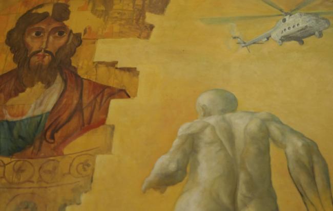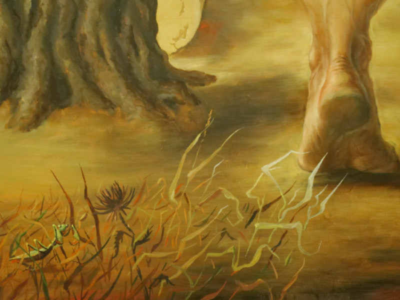 Моментально приковывает внимание фигура человека и отсылка к историческим вехам, но учтены и детали. Малозаметный богомол умело замаскировался в траве. Это жизнь из «другого мира», на который мало кто обращает внимание – мира насекомых. А вдали виднеется стройка крымской атомной электростанции, которая велась в 80-е годы прошлого века.