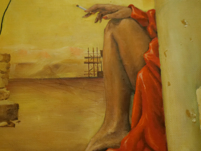 Сюрреализм соседствует с ретроспективной ностальгией – в буквальном смысле слов. Рядом находится картина, на которой художник изобразил себя еще мальчишкой – воспоминания о далеком детстве на холсте.