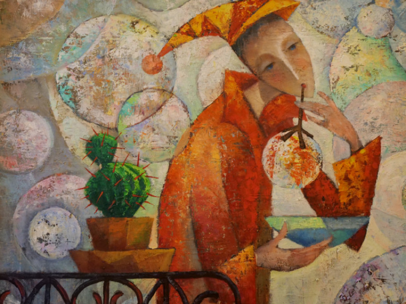 От воспоминаний, ретроспекции – к полетам фантазии. «Мыльные пузыри» – один из примеров, когда картина задает тон и не только его. Мыльные пузыри – нечто красивое, но недолговечное. Рядом стоит кактус, натолкнувшись на которой мыльный пузырь моментально лопнет. По видению художника, здесь можно разглядеть радость и недолговечность одновременно. Но полет фантазии может унести далеко за пределы этого понимания.