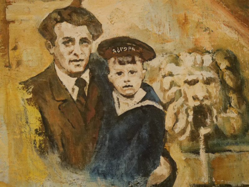 «Здесь я на фоне места, где сейчас находится Синопский спуск. Помню развалены домов, Владимирский собор, который пострадал от бомбежек и обстрелов. Глядя на картину, я вспоминаю, как играл во дворах, поднимался через горку в свою школу. На фотографиях – мои родители. А вот я сижу с отцом на руках возле фонтанчика во дворе», — поделился воспоминаниями Владимир Болотный.