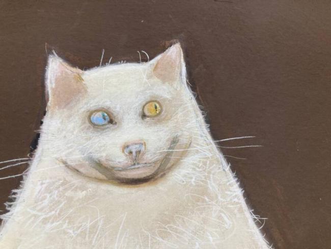 Серия работ Александра Воцмуша задаёт игривую, несерьёзную тональность. Белая кошка с разными глазами — один голубой, другой жёлтый — смотрит в бок с лёгкой усмешкой. Её взгляд безумен, животное похоже на тихого сумасшедшего, которого не боишься, но над которым в душе посмеиваешься. Создаётся впечатление, будто это не портрет конкретного животного, а остроумный типаж. Работа похожа на дружеский шарж. Воцмуш играет, экспериментирует с образом, создавая что-то среднее между иллюстрацией и карикатурой.