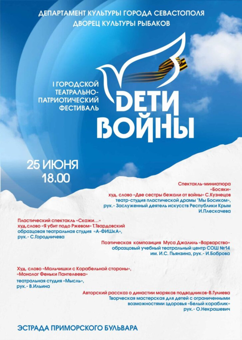 С целью сохранить память о подвиге юных защитников своей страны в те непростые годы посредством театрального искусства в Севастополе пройдёт I городской театрально-патриотический фестиваль «Дети войны». Участники театральных студий со всего города представят свои работы в нескольких номинациях и расскажут невыдуманную историю о том, как выживали «дети войны», как, несмотря на страх, голод и ежедневные бомбёжки, они остались верны себе и своей Отчизне.