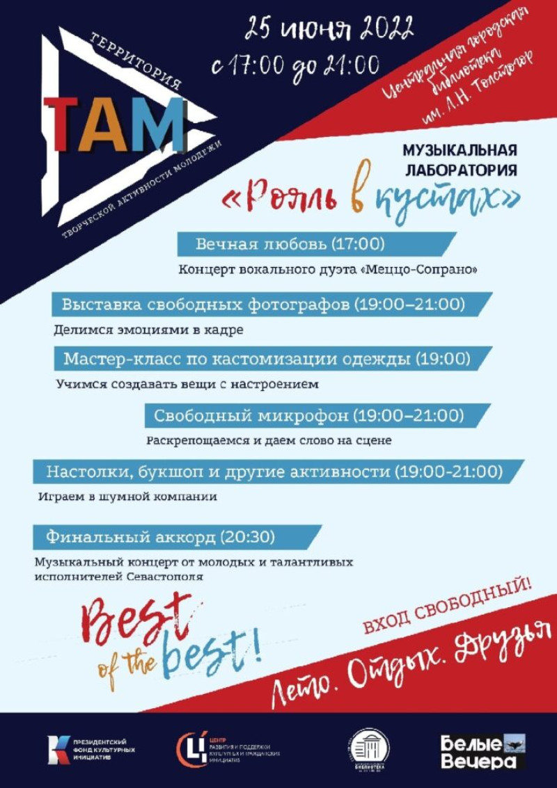 27 июня в России отмечается День молодёжи. В Севастополе основные мероприятия к этому дню развернутся накануне на площадке «Ивушка» в Артиллерийской бухте. Прозвучат песни отечественных исполнителей в авторской интерпретации севастопольских музыкантов. Затем площадка перейдёт в формат дискотеки. В том, что музыка — источник вдохновения и идей в самых разных направлениях творчества можно ещё раз убедиться и на музыкальной лаборатории проекта «Территория ТАМ».