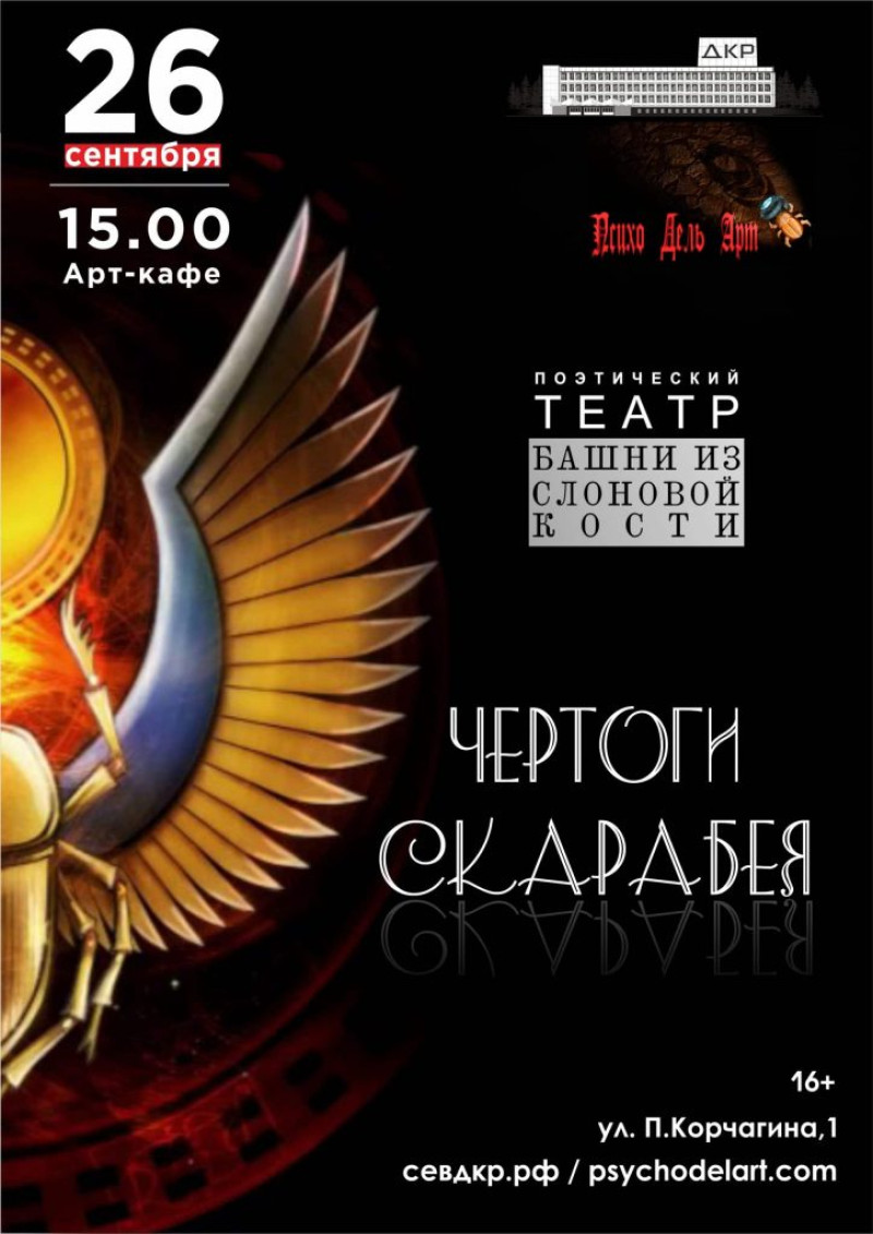 Зрителей, попавших 26 сентября в Арт-кафе Дворца культуры рыбаков, ожидают музыкальные, литературные и театральные сюрпризы. А «вишенкой на торте» станет превращение зрителей в артистов — комических, драматических, характерных — одним словом разных. Организаторы поэтического театра «Башня из слоновой кости. Чертоги скарабея» покажут, что в каждом из нас спит талант Лицедея! Вход свободный. Возрастное ограничение: 16+
