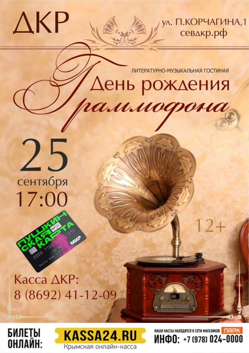 В рамках литературно-музыкальной гостиной, посвящённой Дню рождения граммофона, гости смогут познакомиться с историей создания этого музыкального проигрывателя. Молодому поколению, привыкшему к компактным мобильным плеерам, покажут необычную программу. Она позволит полностью окунуться в эпоху серебряного века и оказаться в импровизированном кафе «Бродячая собака». Там, под чарующие звуки граммофона, читали стихи поэты и собирались почитатели стихотворного таланта. Также зрители смогут посмотреть уникальные экспонаты из семейных коллекций. Мероприятие также доступно по «Пушкинской карте».