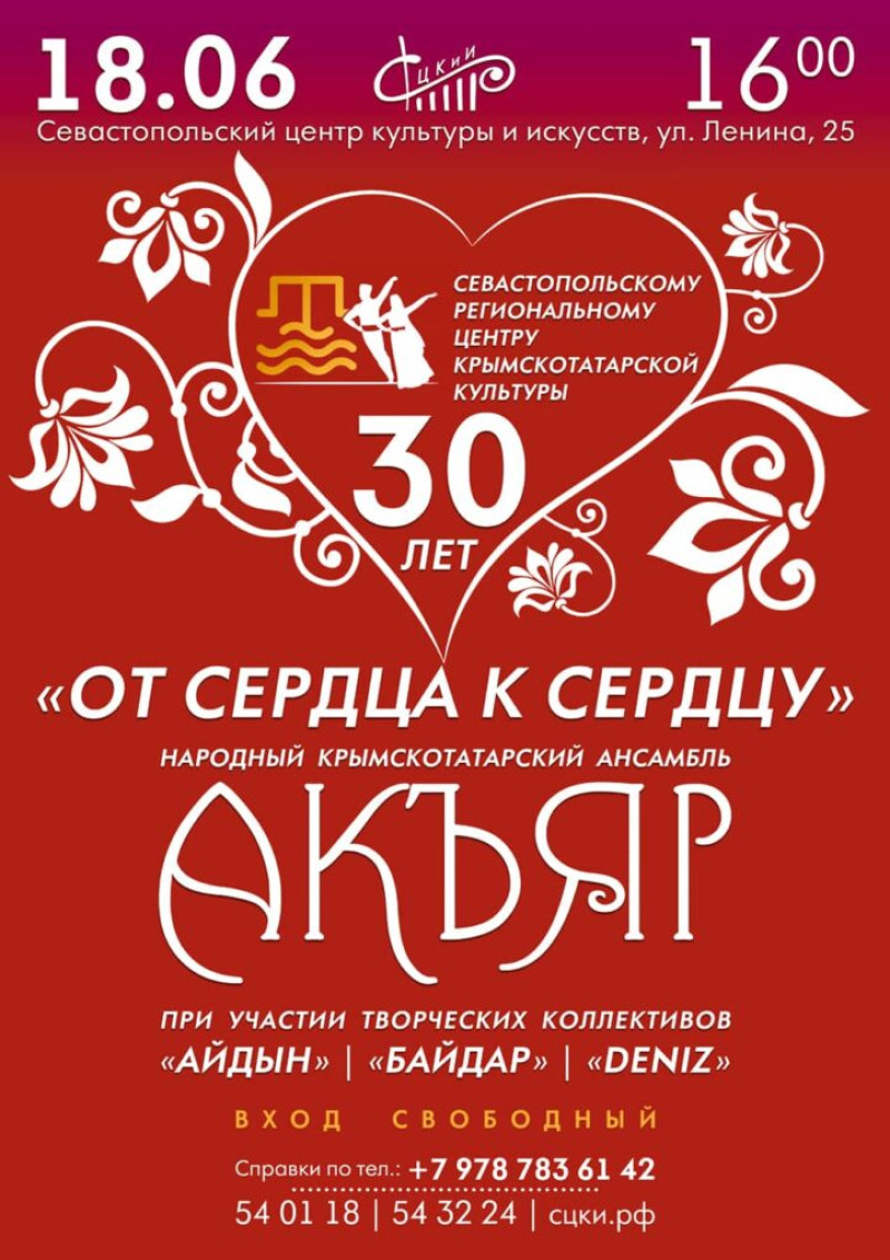 «От сердца к сердцу» — концерт крымскотатарских детских творческих коллективов. Программа посвящена празднованию 30-летия Севастопольского регионального центра крымскотатарской культуры. Вас ждут почти четыре десятка вокальных и хореографических номеров. Зрители увидят не только крымскотатарские, но и русские, украинские, армянские, грузинские, еврейские, испанские, греческие, мексиканские танцы.