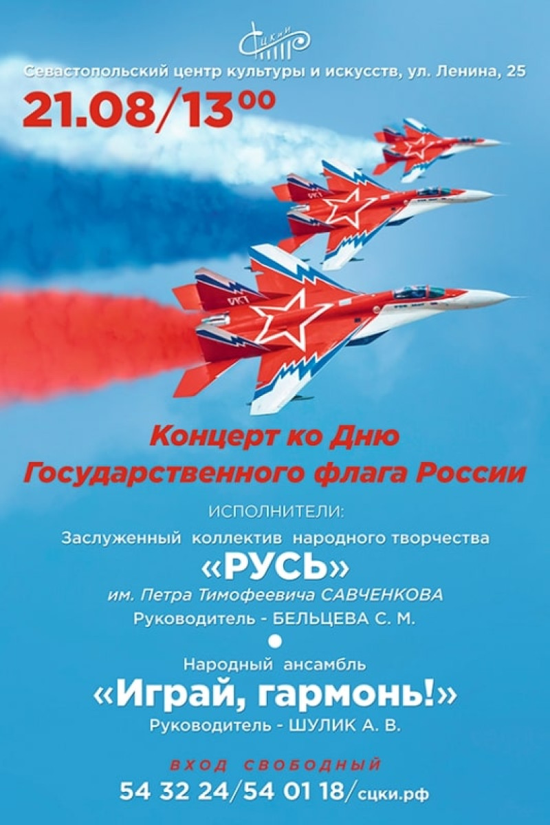 В Севастополе состоится концерт ко Дню Государственного флага России. Зрители услышат народные и патриотические песни в исполнении заслуженного коллектива народного творчества «Русь» имени Петра Савченкова и народного ансамбля «Играй, гармонь».