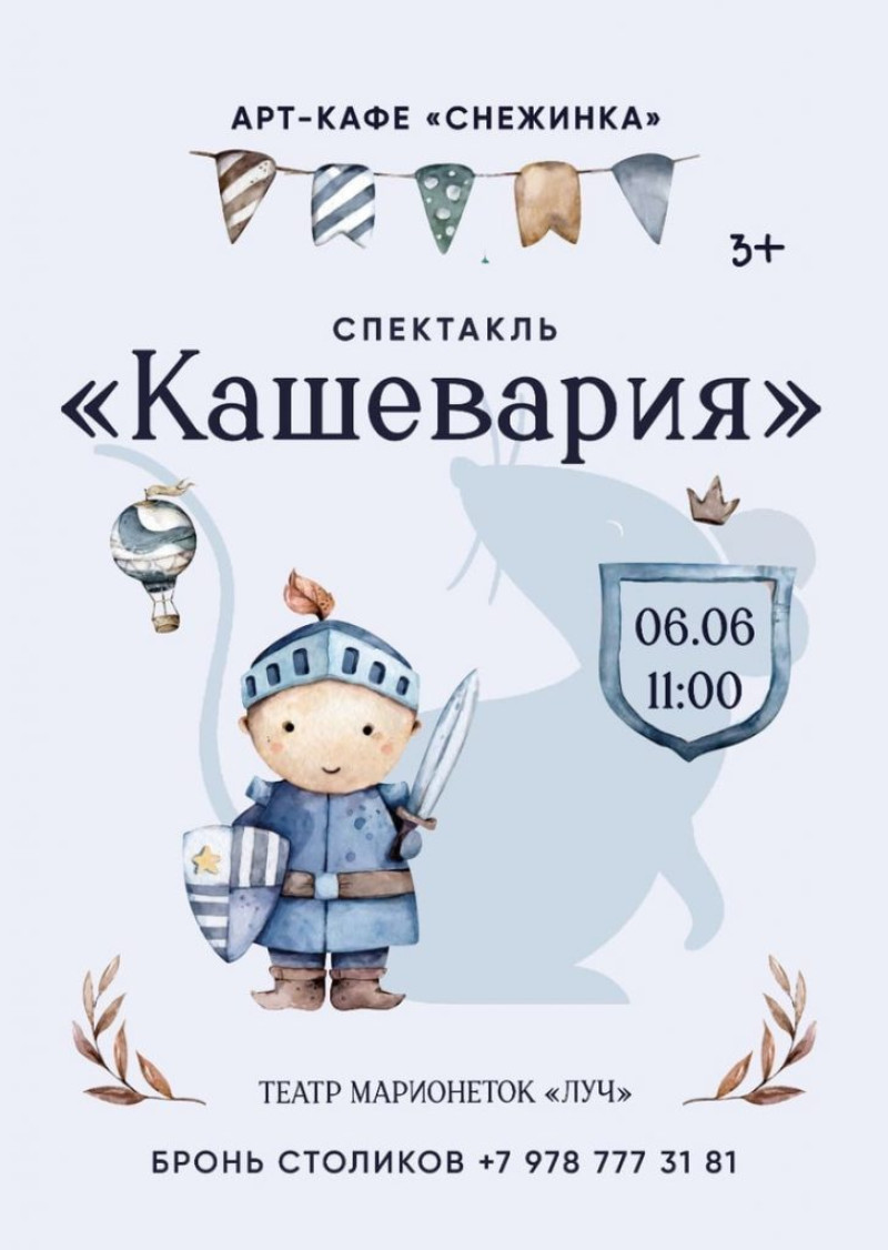 А маленькие посетители и их родители в эти выходные приглашаются на спектакль «Кашевария» в исполнении театра марионеток «Луч». Это сказочный детектив, о том как Ванечка победил амбарную мышь, и спас вкусную страну «Кашеварию» от верной гибели.