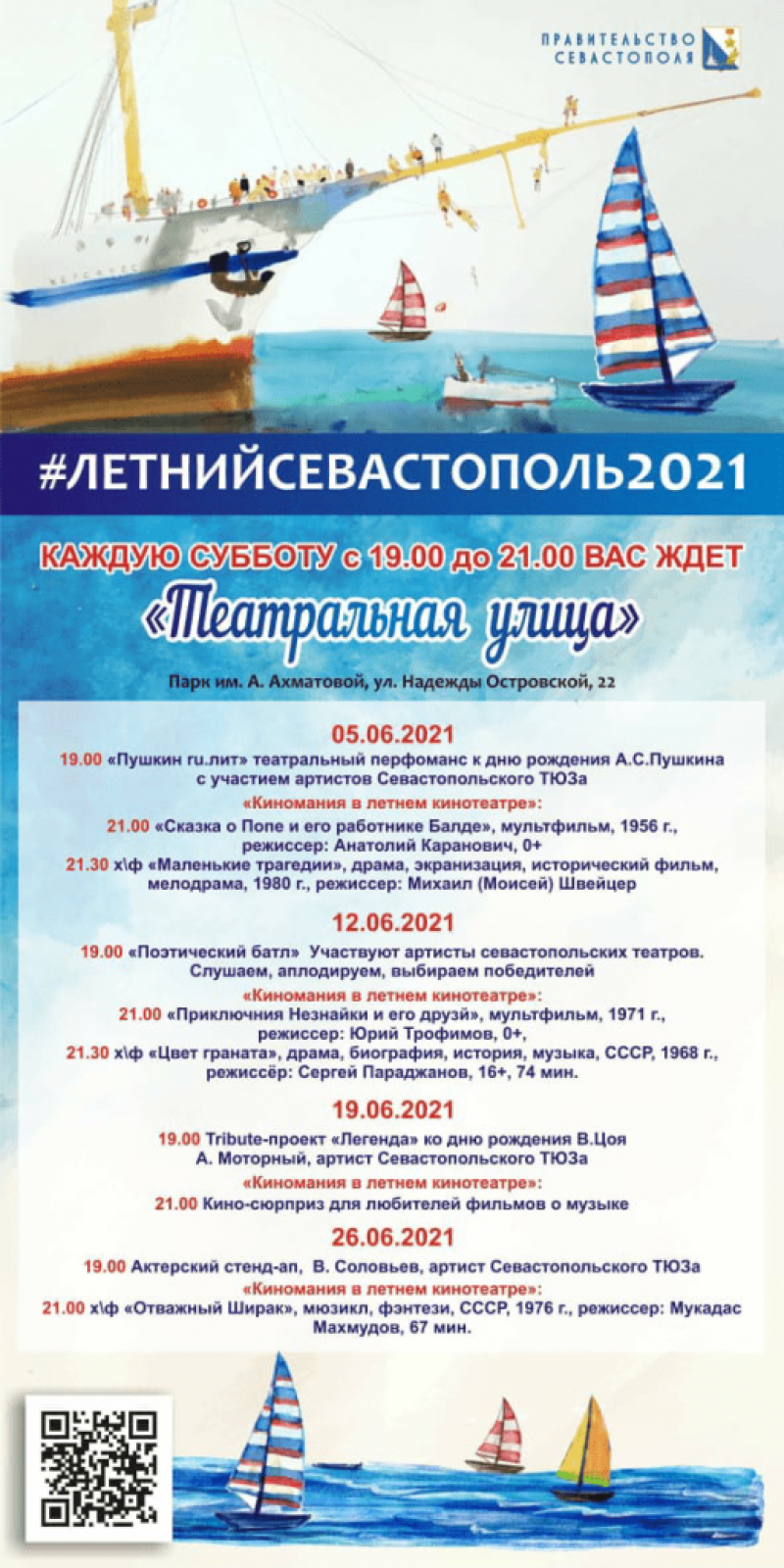 А театр имени Луначарского подготовил литературно-музыкальный вечер, посвящённый дню рождения Александра Сергеевича Пушкина. На площади, перед центральным входом в театр, вас ждут: стихи, вокальные выступления заслуженной артистки Крыма и Украины Виктории Накорнеевой (меццо-сопрано) и лауреата международных конкурсов Анны Качаловой (сопрано), мастер-классы, выставка книг, пленэр для юных художников с педагогами и учениками Севастопольской художественной школы. В программе примут участие артисты театра им. А.В. Луначарского, театра танца им. В.А. Елизарова и театральной студии «Ф’Арт».