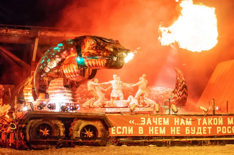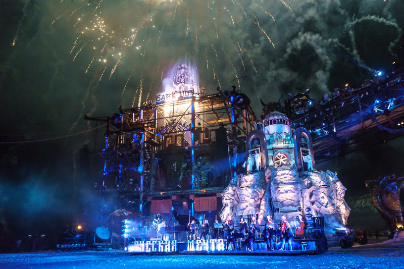 В 23-00 зрители увидят кульминацию «Тень Вавилона» — это масштабное трюковое и пиротехническое, музыкальное и литературное действо с патриотическим акцентом.