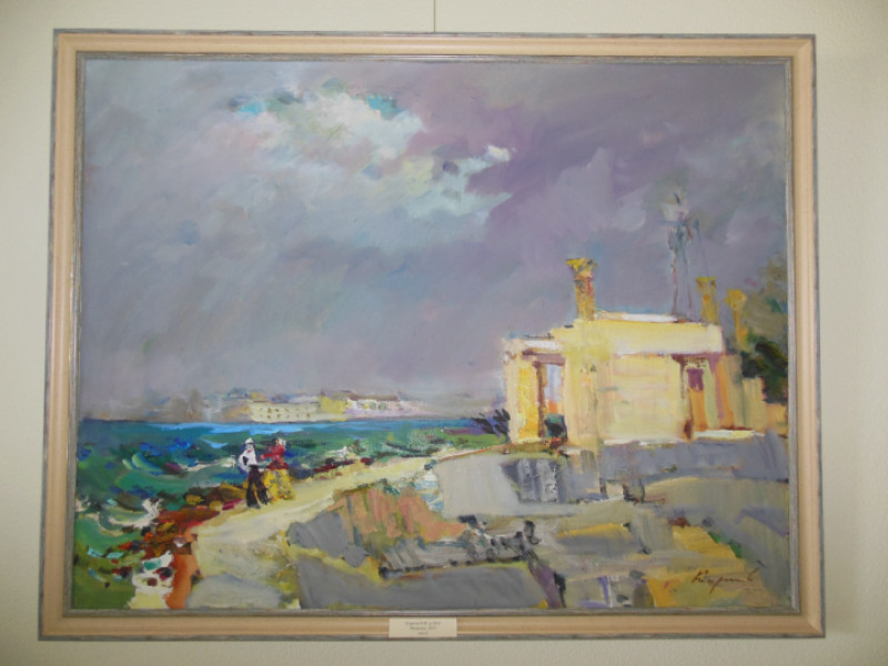 Ненастье. Место действа – Херсонес. Встреча матроса и дамы – это деталь, которая делает картину более живой, и только. Их образы слабо прописаны. Главное – атмосфера. Пасмурная погода постепенно отступает, сквозь серые тучи пробивается свет, который озаряет Херсонес. Проясняется и душа наполняется радостью.