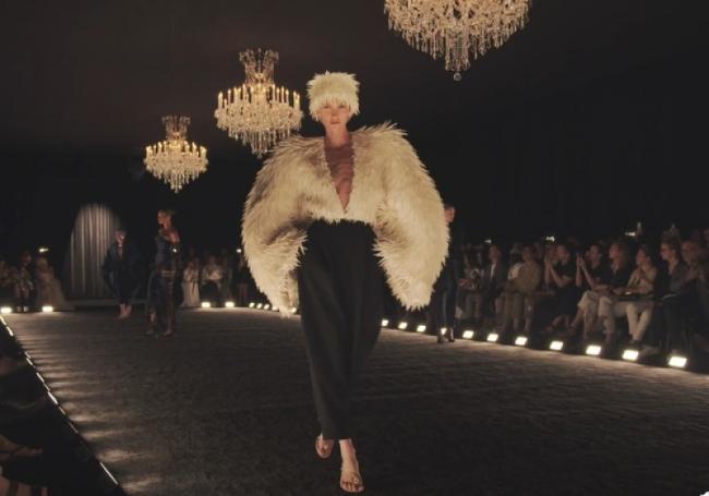 Ближе к концу коллекция сфокусировалась на платьях: из бархата, кожи, золотой фольги. Но самое интересное — последнее платье, которое и не платье вовсе, а моток нейлоновой ткани. Пока другие бренды хотя бы в пресс-релизах переживают за экологию и последствия перепотребления, Демна создает «платье» на один раз. А фрагменты лоскутных кутюрных образов не берет из сэконд-хендов или складов, а создает с нуля. И превращает глобальную проблему в фарс.