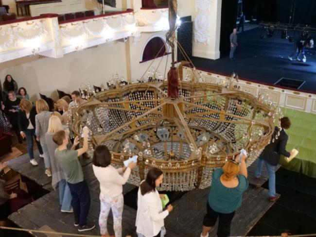 Спуском и помывкой генеральной театральной люстры начался 108-ой сезон для коллектива Севастопольского театра им. Луначарского. 250 лампочек создают блестящий ансамбль света. А возраст то немолодой… «Медузе» уже за 60 лет! Чистоту полуторатонной люстры наводили силами всей труппы, присоединились и близкие друзья театра.