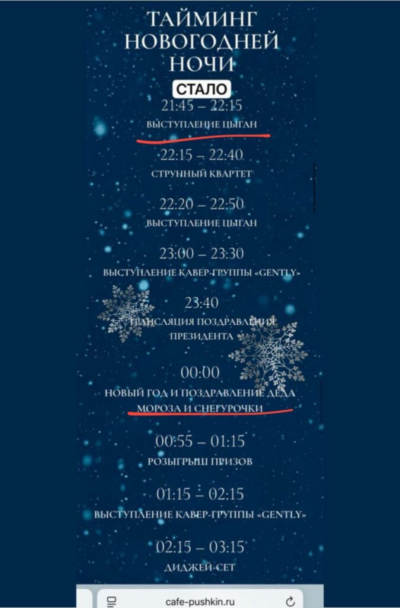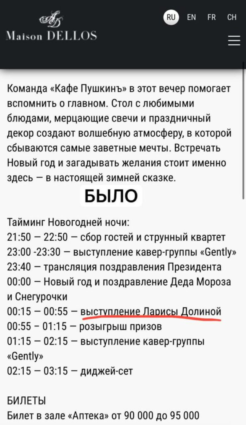 Московский ресторан «Кафе Пушкинъ» убрал Ларису Долину из своей новогодней программы, при этом она всё ещё упомянута в анонсе телеграм-канала.