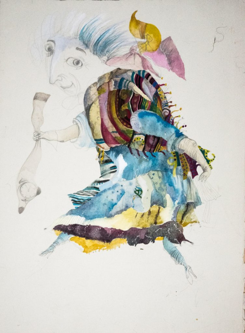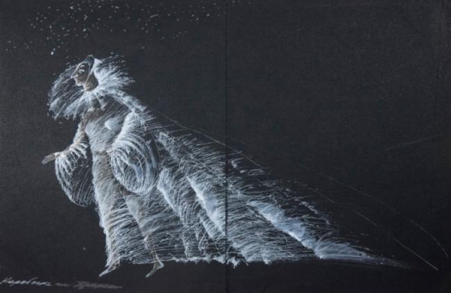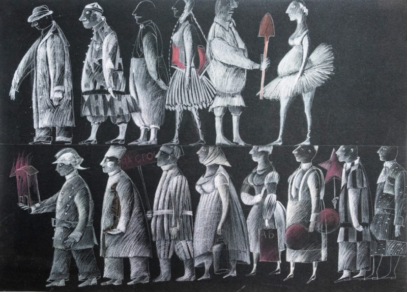 «Я рисую то, что предполагаю будет в постановке, сочиняю эту историю. Она сопряжена с движением. Все герои идут. И очень обращены направо. Я подумала — нет. Они должны ещё идти вперед или налево, но ни в коем случае не назад».