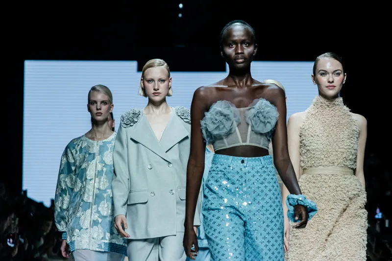 «Электрические» жакеты и плащи на показе hatsibana сразу взбудоражили воспоминания о лучших показах Armani Privè. Переливы ткани на острых плечах жилетов и пальто вступили в удивительный симбиоз с этническими узорами Кабардино-Балкарии (оттуда родом дизайнер бренда Фати Шогенова). Фольклорные мотивы нашли своё отражение в узорах шиповника (символ hatsibana) в зоне декольте и на плечах. Интересно также взглянуть на переосмысление традиционных головных уборов: некоторые из них представили в виде металлических каркасов. Показ hatsibana — яркий пример сочетания этники и подходов высокой моды.