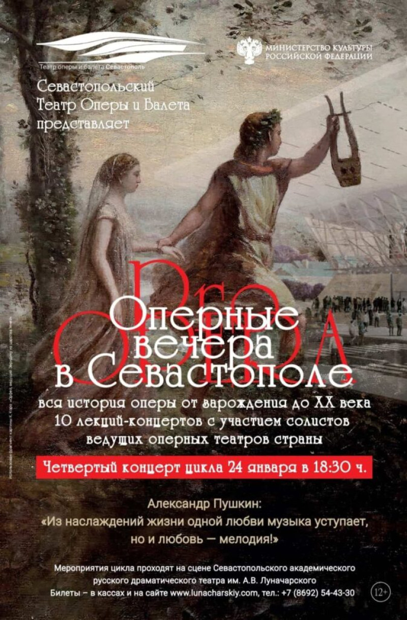 А уже через неделю, 24 января, Севастопольский театр оперы и балета представит оперный вечер, посвящённый реформам композиторов Вены XVIII — начала XIX веков. В программе вечера: арии и ансамбли из опер Глюка, Гайдна, Моцарта, Сальери и Бетховена. Традиционно вечер пройдёт в театре имени Луначарского. Начало в 18:30.