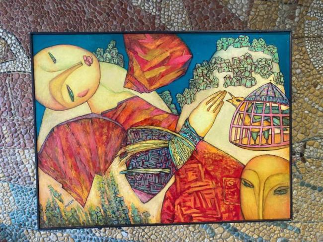 На одной из композиций изображены несколько персонажей с условными, обобщёнными лицами жёлто-охристого тона. Их тела покрыты узорами, напоминающими архитектурные планы, лабиринты, орнаментальные мотивы. Центральная фигура держит клетку, справа видны миниатюрные здания — целый город, растущий из тела персонажа.