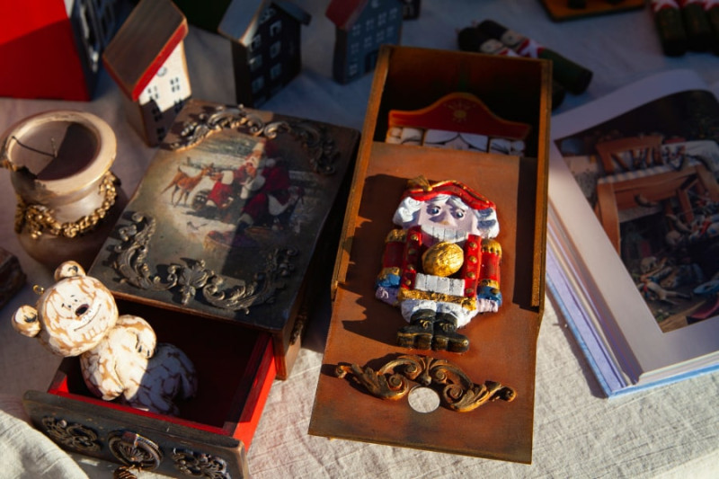 Здесь и шляпная коробка, выполненная в технике состаривания (имитация барабана) — предмет декора, посвящённый сказке Гофмана «Щелкунчик и мышиный король»; и Буратино Алексея Николаевича Толстого; и Щелкунчик, сделанный, как положено, из дерева.