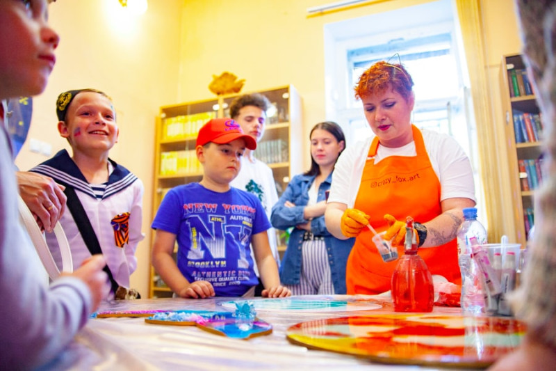 Азы старинного ремесла освоили гости «Библионочи». Уже одно название мастер-класса «Неоновая хохлома» говорит о том, что без небольшого отступления от классики не обошлось. Наряду с традиционными для этой техники красками использовали неоновую — обладающую свойствами люминесцентности.