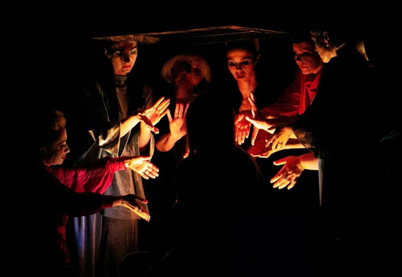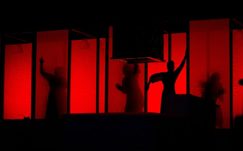 Видеография, которая транслируется на чёрный экран, нависающий над сценой сверху. О ней стоит написать отдельно. Она словно расширяет зрительское восприятие ситуации, глубже погружает в нужную атмосферу, вырывая из текущего момента, из пространства и времени. Вот чья-то тень почти открывает запертую дверь, но ключ выпадает из рук. Вот кто-то заносит нож над юной жертвой. Вот лица героинь — чистые, светлые, без масок социальных ролей. Видео напомнило мне «Андалузского пса» Бунюэля и «Персону» Бергмана.