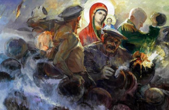 «Здесь есть элемент ассоциативности восприятия. Я хотел донести до зрителя то, что здесь происходило. Ведь люди, которые стояли на бастионах – из плоти и крови. Они отважно «стояли против чугуна». В этом аду люди сражались и давали достойный отпор противнику. Изображенная Владимирская Божия Матерь была почитаема в царской семье и у защитников Отечества. Вера — дала людям крепость духа. С ней и за неё люди умирали. За Веру, Царя и Отечество – такой лозунг был. За Веру, заметьте, было первостепенно», — рассказал Сергей Берлов.
