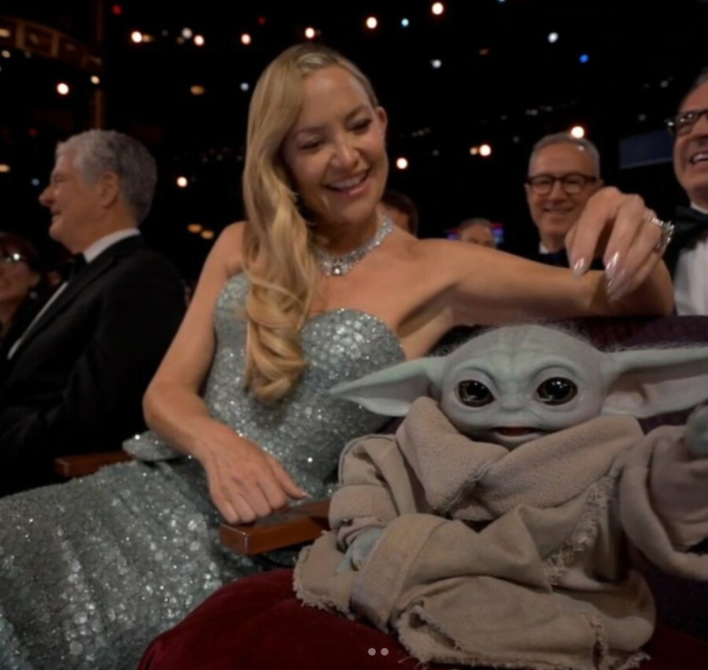 - На церемонии «присутствовал» Грогу — милый персонаж сериала «Мандалорец» по вселенной «Звёздных войн». Он сидел рядом с актрисой и номинанткой этого года Кейт Хадсон, которая пыталась научить его хлопать в ладоши.