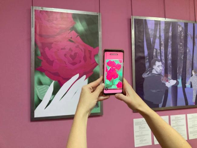 Скачав мобильное приложение и наведя смартфон на картину, зритель может увидеть короткий анимированный ролик. Изобразительная история оживает с помощью дополненной реальности едва ли не по-настоящему. Так приобретается объём и сюжет, не в лингвистическом смысле, а вполне себе в мультипликационном. Оживают полотна-принты: сложные композиции, портреты и пейзажи. Мы слышим шум волн и автоматные выстрелы.