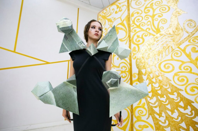 Для автора коллекции геометрические формы – это отсылка к элементарным частицам, которые создают сложные миры человека, новую структуру. Оригами из оригинальных афиш к фильмам Тарковского как кристаллы «усеяли» строгие чёрные платья. К примеру, на один рукав была использована двухметровая афиша к фильму «Каток и скрипка». Способ крепления элементов остался в секрете.