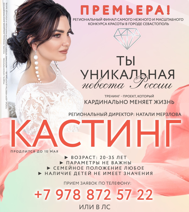 Финал конкурса красоты «Ты уникальная невеста России» — это масштабное гала-шоу, которое состоится в Севастополе 21 июня. Если хочешь узнать себя с другой стороны, стать частью большого красивого шоу, а также хочешь побороться за главную «уникальную» корону, то мы ждем тебя на кастинге по предварительной записи по тел. +79788725722. Для участия в кастинге тебе должно быть от 20 до 35 лет. Рост, параметры, семейное положение и наличие детей нам не важны.