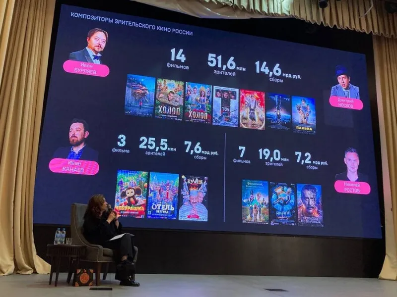 Она представила статистику самых кассовых российских фильмов последних лет и композиторов, написавших к ним саундтреки. Два композитора — Иван Бурляев и Дмитрий Носков — написали музыку к 14 лентам, собравшим почти 15 млрд рублей (52 миллиона зрителей). Три фильма с музыкой Ивана Канаева посмотрели 26 миллионов зрителей, сбор — 8 млрд рублей.