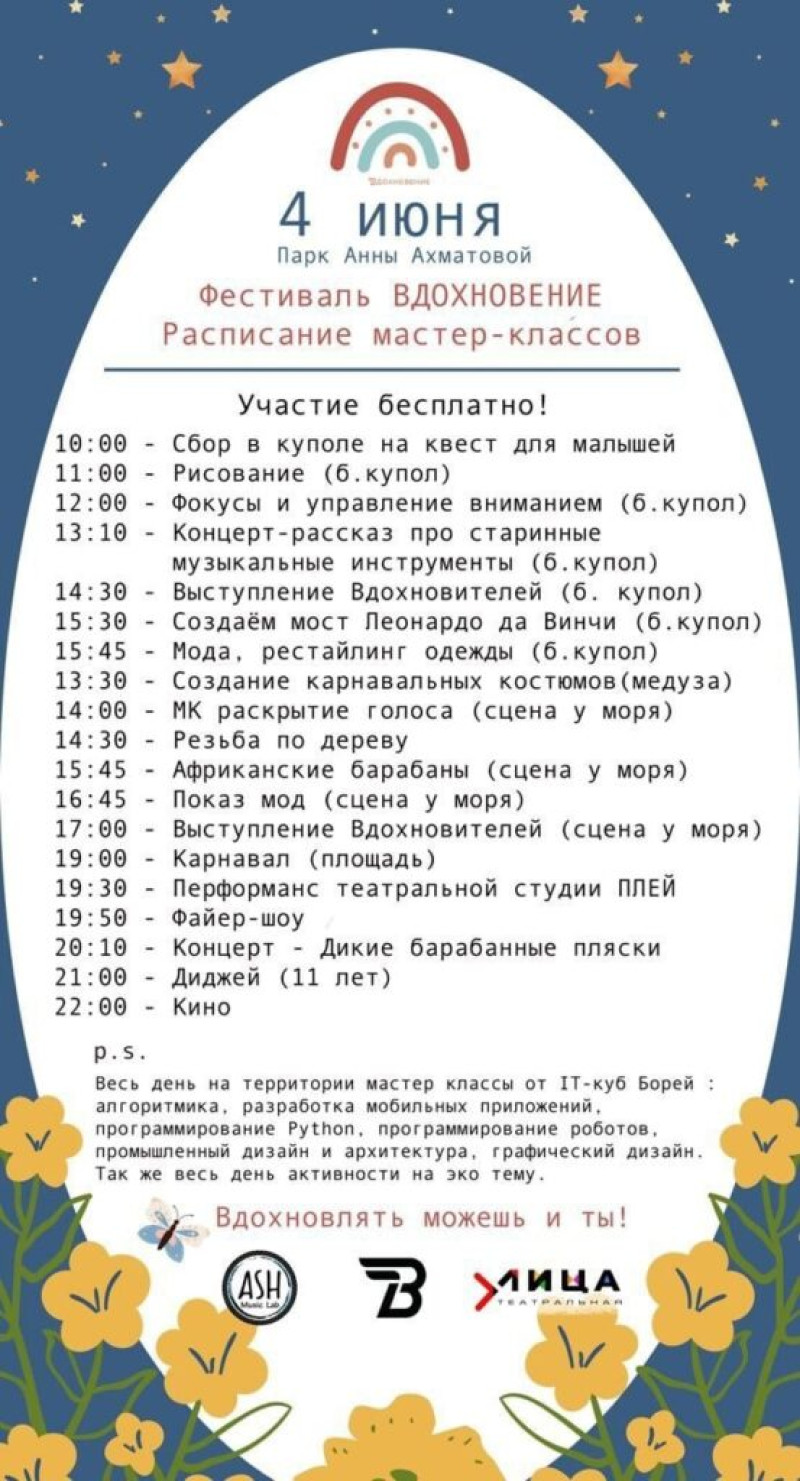 Сделать событие ярким и захватывающим поможет музыка. На фестивале выступит 11-летний Даниил Егоров из Симферополя. Несмотря на свой юный возраст, он уже стал одним из самых известных и талантливых диджеев России. В парке Анны Ахматовой Даниил исполнит свой собственный DJ-сет.