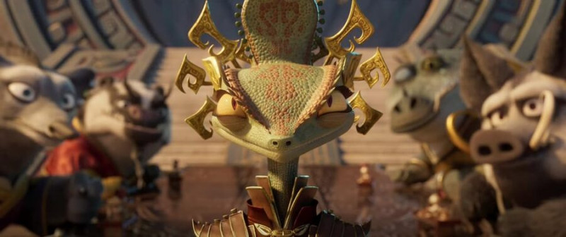 Помешать в этом ему намеревается новая злодейка — колдунья Хамелеон. Режиссёр Майк Митчелл описывает её так: «Она самая маленькая из всех злодеев, с которыми По когда-либо сталкивался. Но у неё такое мощное присутствие. Она властная и, честно говоря, немного смешная, но в основном страшная и пугающая. Это самый умный злодей, с которым когда-либо сражался По. Она может превращаться в существо любого размера. И более сверхъестественна, чем все злодеи, с которыми сталкивался По».