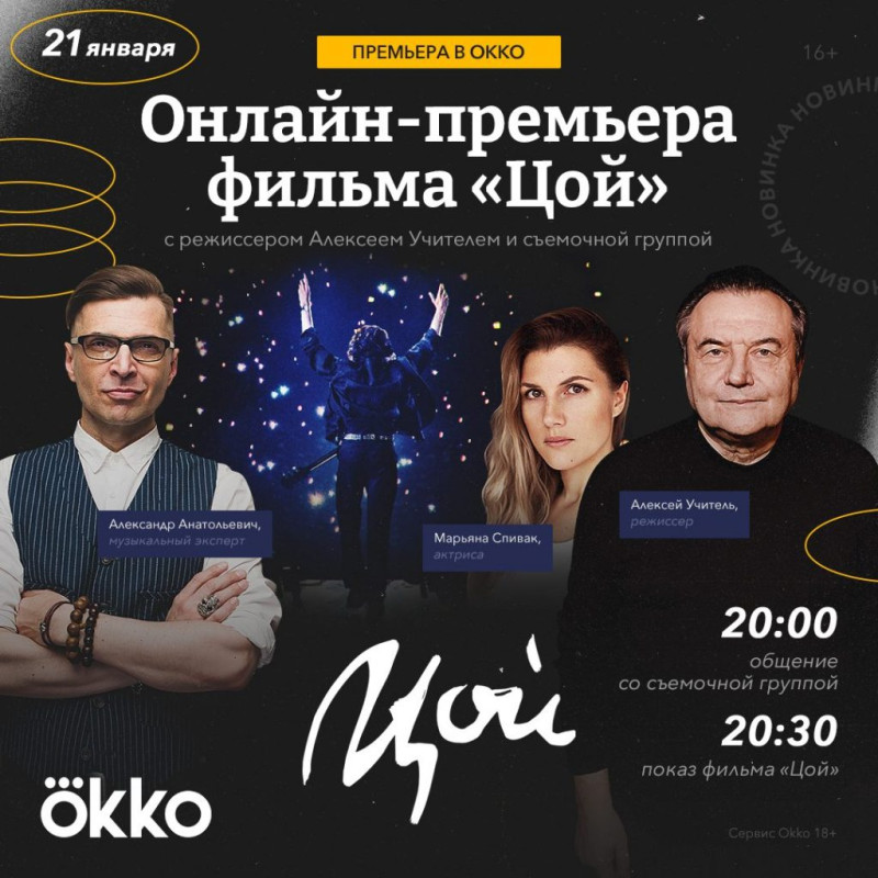 Первой онлайн-премьерой станет «Цой» Алексея Учителя. 21 января в 20:00 Учитель и исполнительница одной из главных женских ролей Марьяна Спивак лично представят фильм пользователям сервиса, а приглашённый музыкальный эксперт — виджей MTV Александр Анатольевич — расскажет про феномен группы «Кино» и то, как она повлияла на массовую культуру в эпоху 90-х.