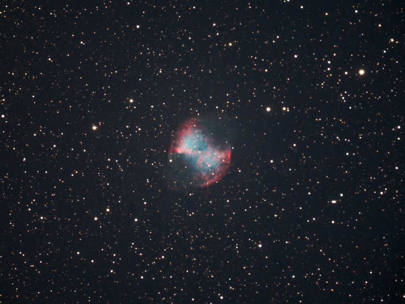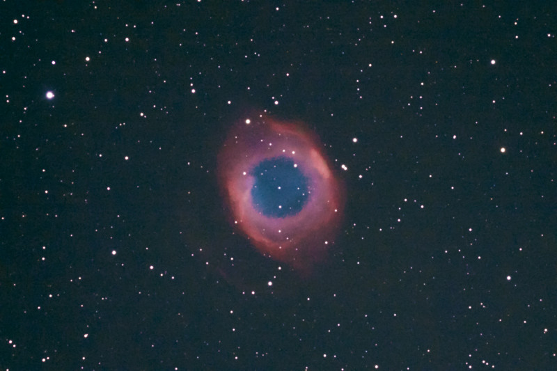 Необычной получилась фотография туманности «Улитка». Сергей рассчитывал поймать её внешнее кольцо. Но неожиданно внутри проявилась голубая дымка (оболочка, в которой находится звезда) — а её непросто увидеть.