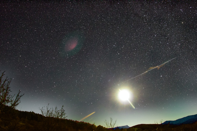 На этой фотографии вовсе не Солнце, как может показаться на первый взгляд. Это Луна, которая выглядит такой яркой благодаря большой экспозиции. Линия возле неё — тот редкий случай, когда в кадр случайно попал метеор.