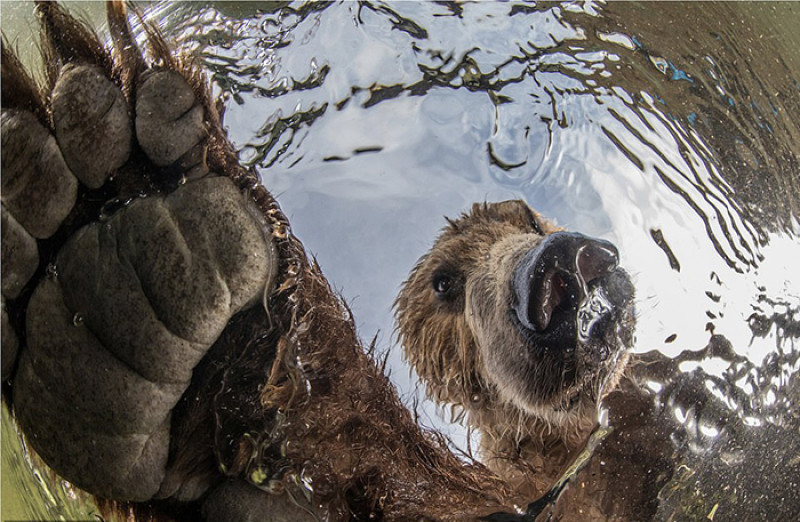 Победителем в категории «Дикие животные на земле» стал Михаил Коростелев с его подводной фотографией бурого медведя. Кадр показывает животного в процессе ловли лосося в Южно-Камчатском заповеднике. Именно здесь находится самая большая популяция бурых медведей в России. Чтобы сделать этот снимок, фотограф управлял камерой дистанционно.