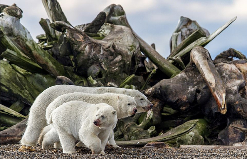 В этой же категории одним из финалистов стал Даниель Дитрих со снимком трёх белых медведей, идущих мимо огромного скелета кита. Фотография сделана на Аляске. У белых медведей носы испачканы кровью, что означает, что они недавно с охоты. Обычно белые медведи охотятся в одиночку, за исключением детенышей, как на этой фотографии. Видимо, здесь снята медведица с двумя своими детёнышами.