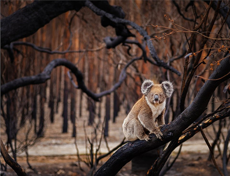 Отсутствие дождей привели к пожарам. Для медленно двигающихся животных шансы выжить в подобных обстоятельствах мизерно малы. Именно поэтому фотограф Джули Флетчер очень удивилась, увидев в сгоревшем лесу живую коалу: «Всё время, что я шла, она не сводила с меня глаз».
